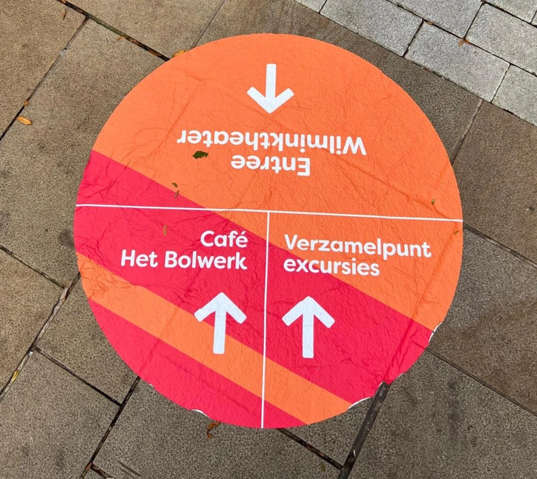 Vanuit die inzichten begonnen we de routes tussen de locaties vorm te geven. We bekeken hoe bezoekers zich logisch zouden verplaatsen: van het station naar het Wilminktheater, door richting Café Het Bolwerk, verder naar Metropool en uiteindelijk naar het Muziekcentrum. Door verschillende wegwijs-oplossingen ontstond er een natuurlijke bezoekersreis door de stad. In de straten verschenen wegwijzerpalen, stoepborden, asfaltstickers en signing torens waar bezoekers in één oogopslag hun weg kunnen vinden in een onbekende stad.